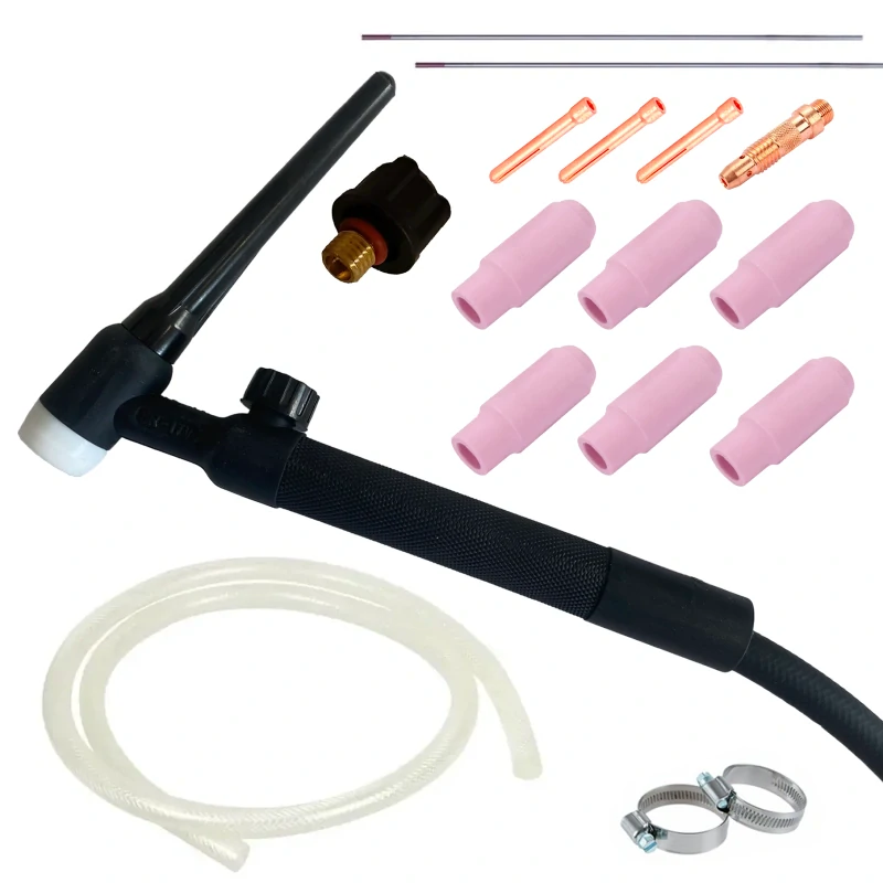 Sada obsahuje všetko potrebné pre začatie práce: zvárací horák SOLUTION TIG 17V, keramické hubice, klieštiny, kryty elektród, elektródy a hadicu, čím sa stáva kompletným riešením pre váš zvárací projekt. S maximálnym zaťažením 130A a 3-metrovou dĺžkou horáka s držiakom je tento systém ideálny pre široké spektrum zváracích aplikácií, pričom jeho chladenie plynom zabezpečuje spoľahlivý a stabilný výkon.